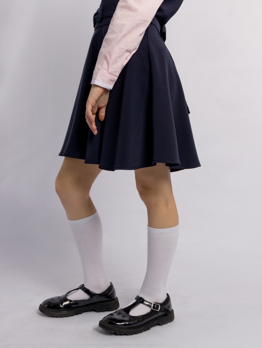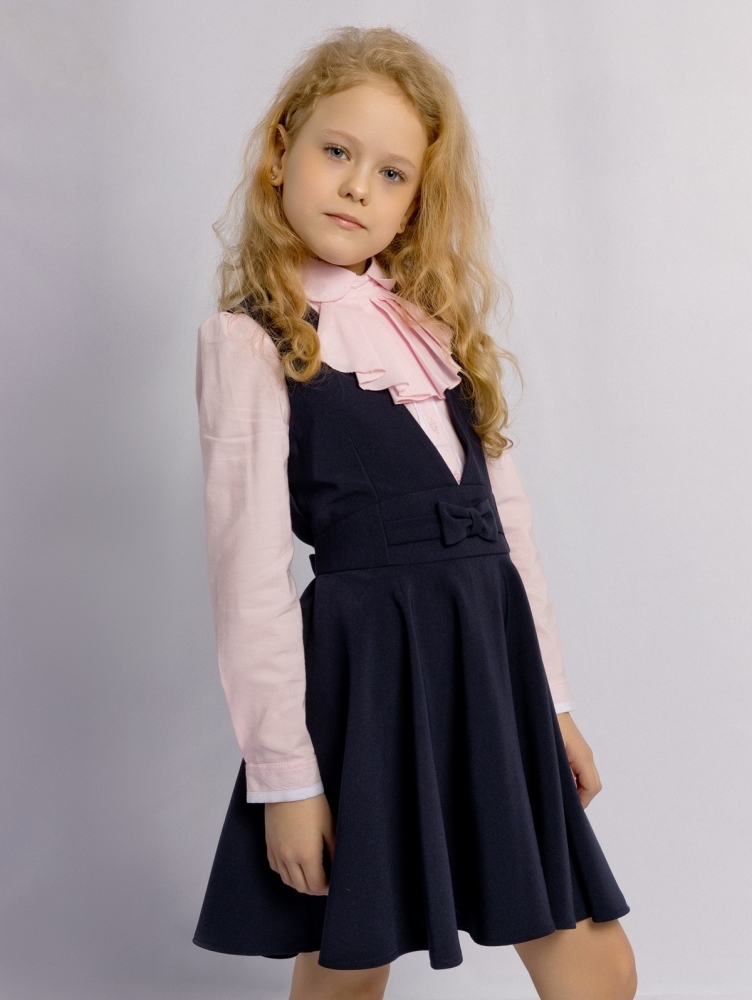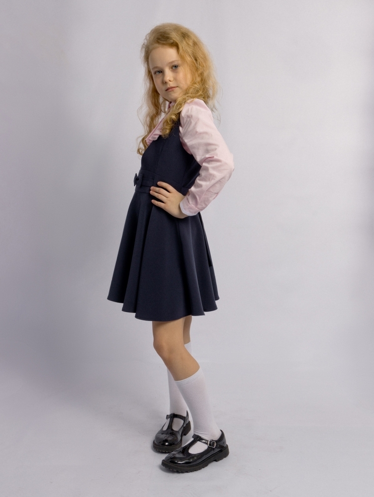 Юбка полусолнце. Глубокий V-образный вырез. Украшено бантиком. Полноту возможно регулировать с помощью пояса.
