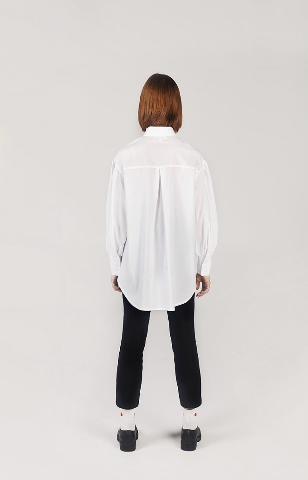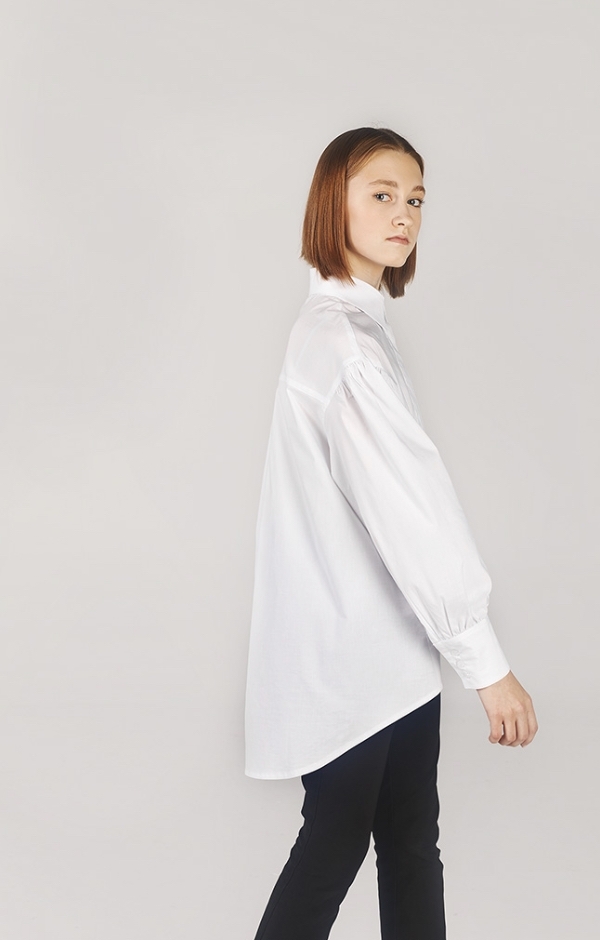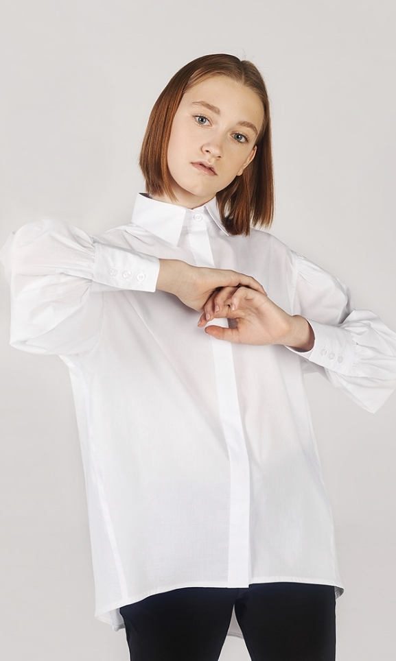 - Тренд. Объемная блузка со спущенным плечом и широким рукавом. Манжет на 3 пуговицы. Застежка супатная. Низ блузки с удлиненной спинкой